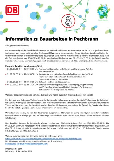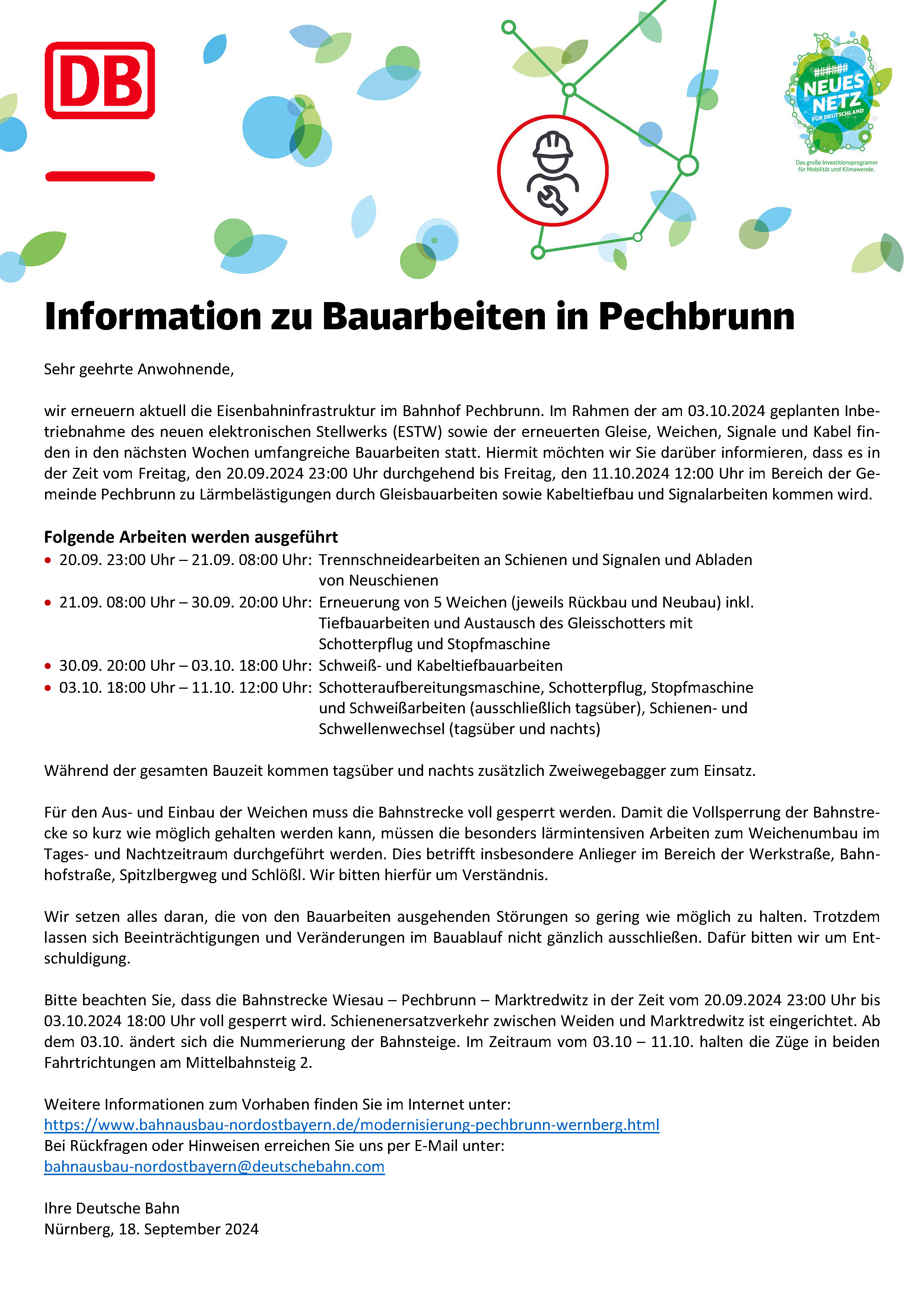 Die Erneuerung der Eisenbahninfrastruktur am Bahnhof Pechbrunn geht auf die Zielgerade: In den kommenden Tagen werden Schienen und Weichen verlegt. Dafür muss die Bahnstrecke zwischen Marktredwitz und Wiesau bis 03. Oktober 2024 gesperrt werden. Am Tag der Deutschen Einheit nimmt die Deutsche Bahn dann das neue Elektronische Stellwerk (ESTW) Pechbrunn in Betrieb. Dieses sorgt künftig für zuverlässigere Verbindungen an der Schnittstelle zwischen Oberfranken und der Oberpfalz. Um die Sperrpause möglichst kurz zu halten, arbeiten wir mitunter auch nachts. Für den entstehenden Lärm bitten wir die Anwohner um Verständnis. Die DB schließt die Bauarbeiten bis 11. Oktober 2024 ab.