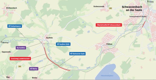 - Umbau des BÜ Seulbitz B289 am Bahn-km 109,593 – Verbreiterung der Straße auf das erforderliche Maß für den Begegnungsverkehr und Erneuerung der Sicherungstechnik