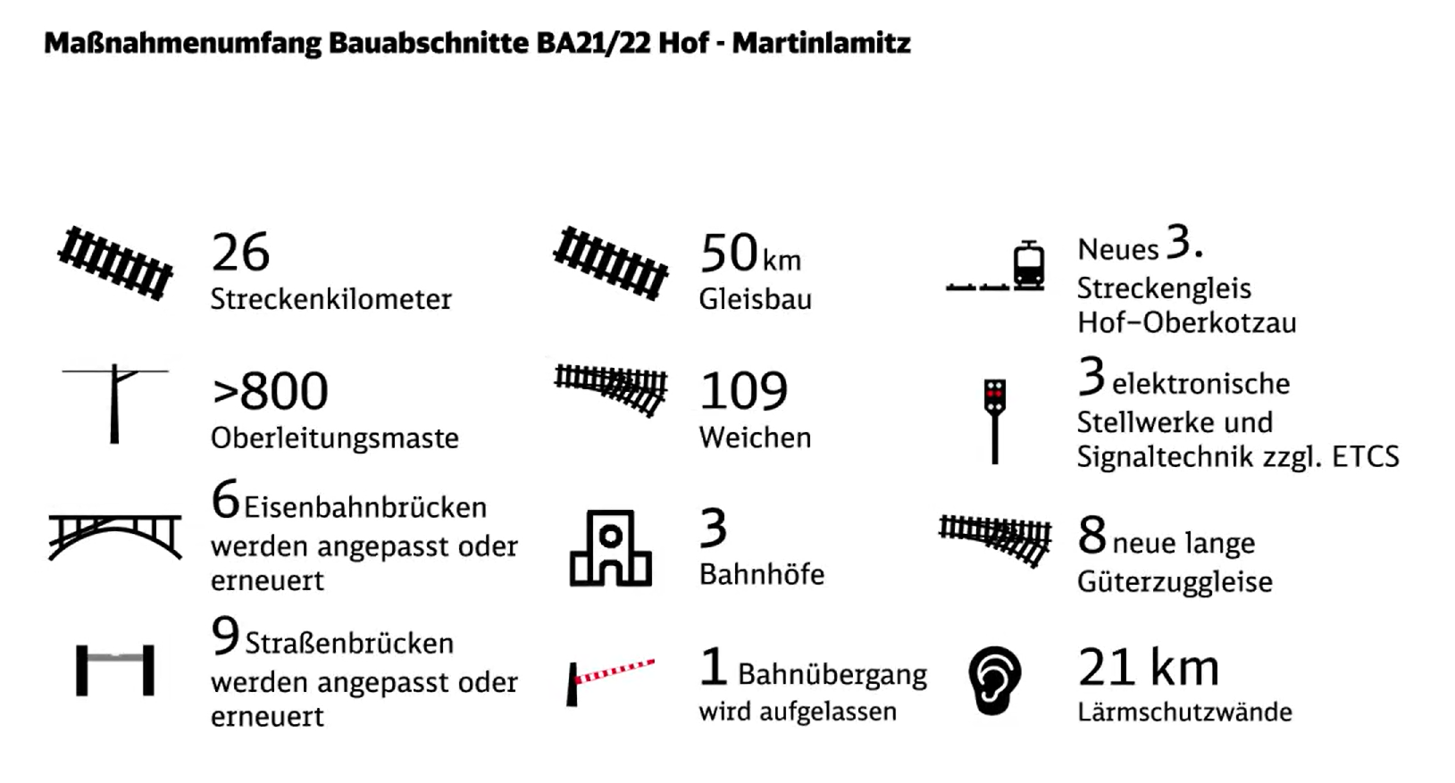 Anfang Mai haben wir unsere Genehmigungsplanung zu den Bauabschnitten 21 und 22 im Landkreis Hof beim Eisenbahn-Bundesamt eingereicht. Wir gehen aktuell davon aus, dass das Genehmigungsverfahren nach Abschluss der bayerischen Sommerferien durch die zuständige Behörde eröffnet wird. Bis zum 1. September 2024 haben Sie noch die Möglichkeit uns direkt Fragen zum Projekt in unserem Onlinetool zu stellen.