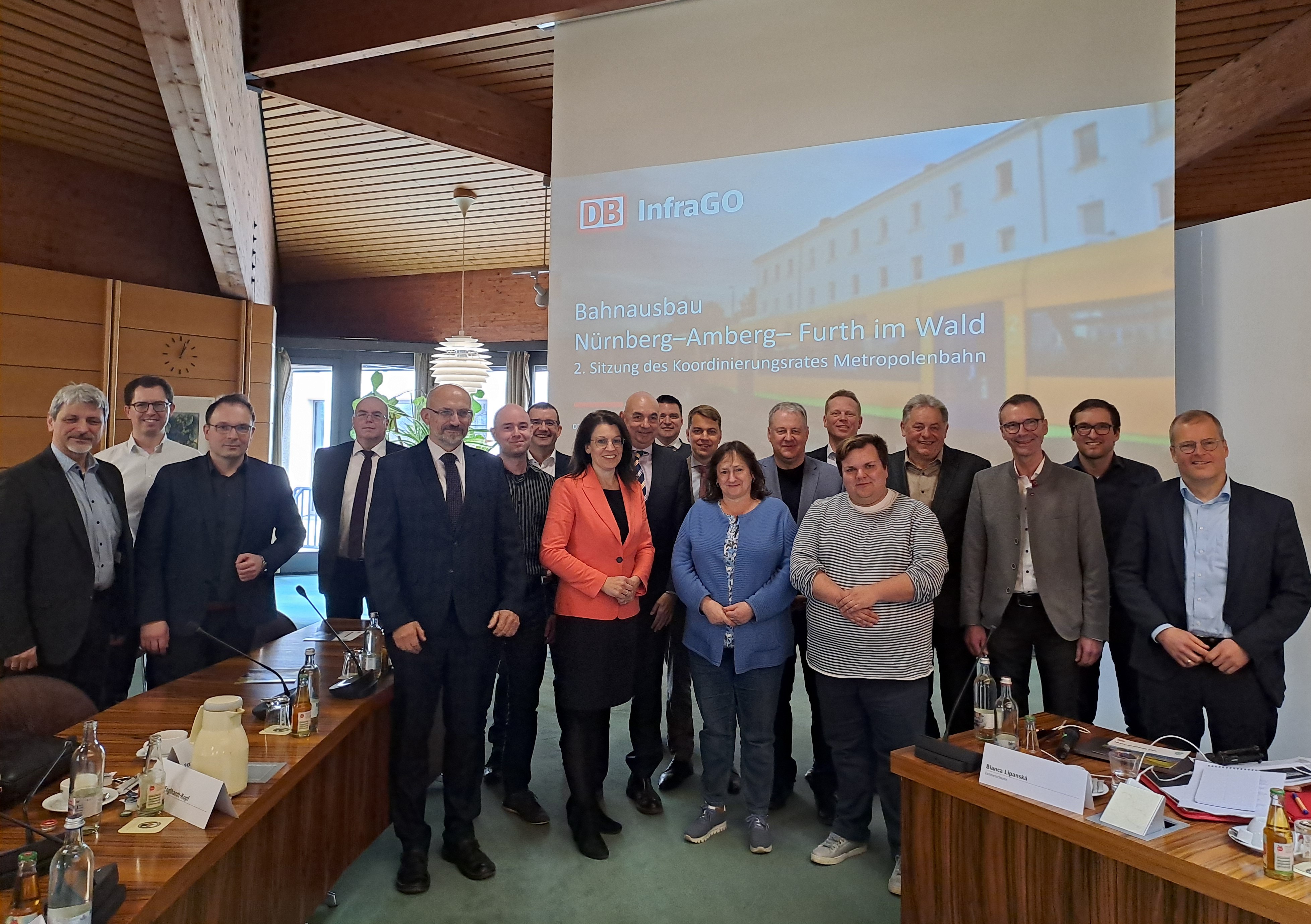 Am 7. März 2024 tagte der Koordinierungsrat Bahnausbau Nürnberg–Amberg–Furth im Wald zum zweiten Mal. Die Sitzung fand im Landratsamt Cham statt. Matthias Trykowski, Leiter des Bahnausbaus Nordbayern, Norman Wilk, Leiter der nordostbayerischen Ausbauprojekte sowie Marc Nöker, Projektleiter der Metropolenbahn informierten die Mitglieder über den aktuellen Planungsstand und stellten die neuesten Fortschritte vor. In diesem Zuge veröffentlichten wir auch ein Video, in welchem Marc Nöker das Projekt Metropolenbahn vorstellt. Zum Video gelangen Sie hier. Selbstverständlich wurden die Fragen der Vertreter:innen aus Politik, Wirtschaft, Initiativen und Verbänden beantwortet und ihre Hinweise wurden für die weitere Planung aufgenommen. Der Austausch mit den Mitgliedern des Koordinierungsrates sind ein wichtiger Teil der Öffentlichkeitsbeteiligung. Die Sitzung wurde schriftlich festgehalten. Das Protokoll sowie die Präsentation der Veranstaltung sind in unserer Mediathek.