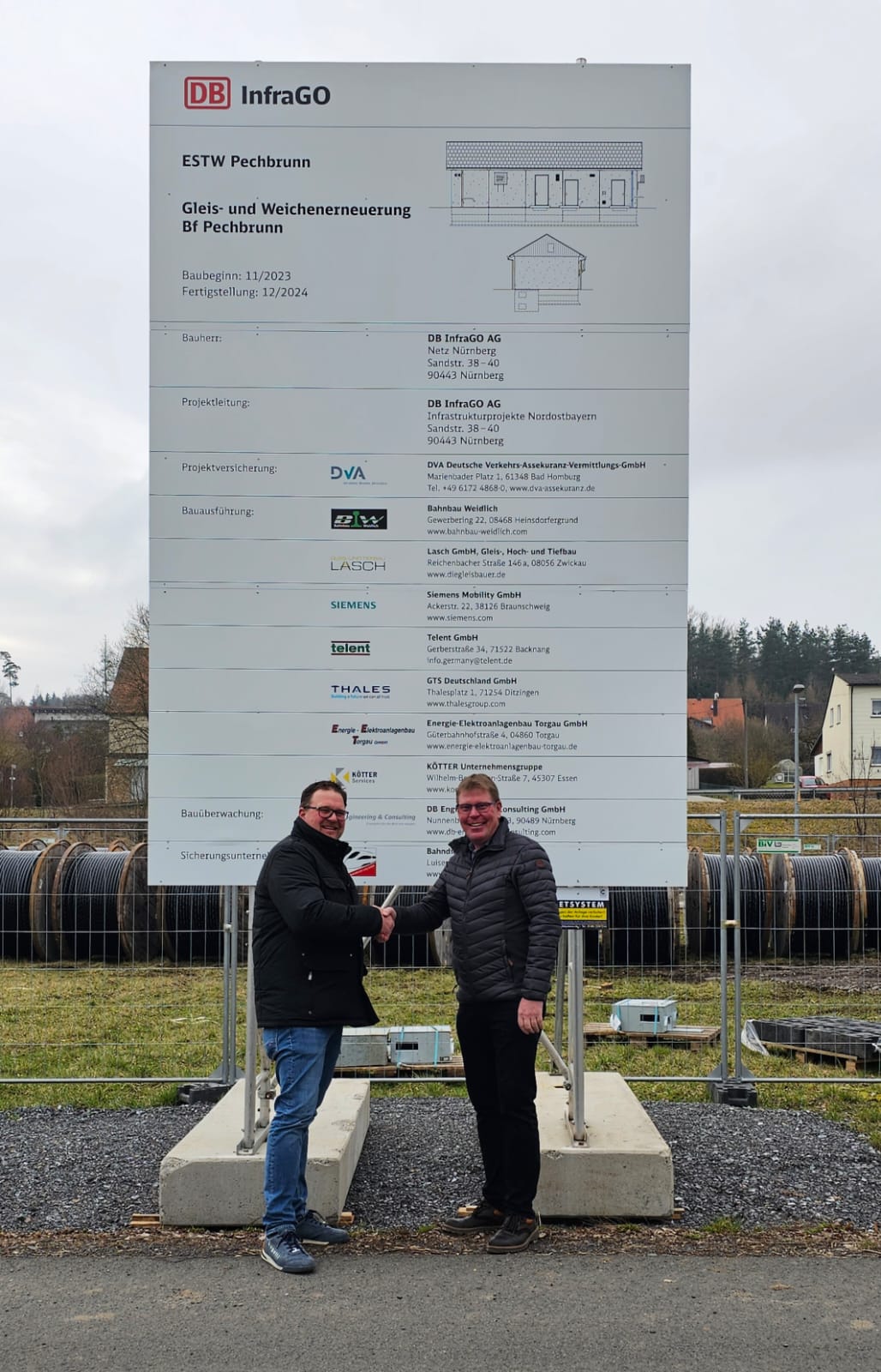 Unlängst hat die Deutsche Bahn das neue Stellwerksgebäude am Bahnhof Pechbrunn fertiggestellt. Nun nimmt die Modernisierung weiter Fahrt auf: 2024 erneuern wir Weichen und Gleise im Bahnhofsbereich erneuert und bauen alle Signale neu. Mehr Zuverlässigkeit erhält die Überleitstelle durch eine Weichenheizungsanlage. Mit dem Einbau von elektronischer Stellwerkstechnik schließen wir die Arbeiten voraussichtlich im Oktober 2024 ab. Über den Baufortschritt hat Projektleiter Andreas Meusel (im Bild rechts) jetzt Pechbrunns Bürgermeister Stephan Schübel (im Bild links) vor Ort informiert.