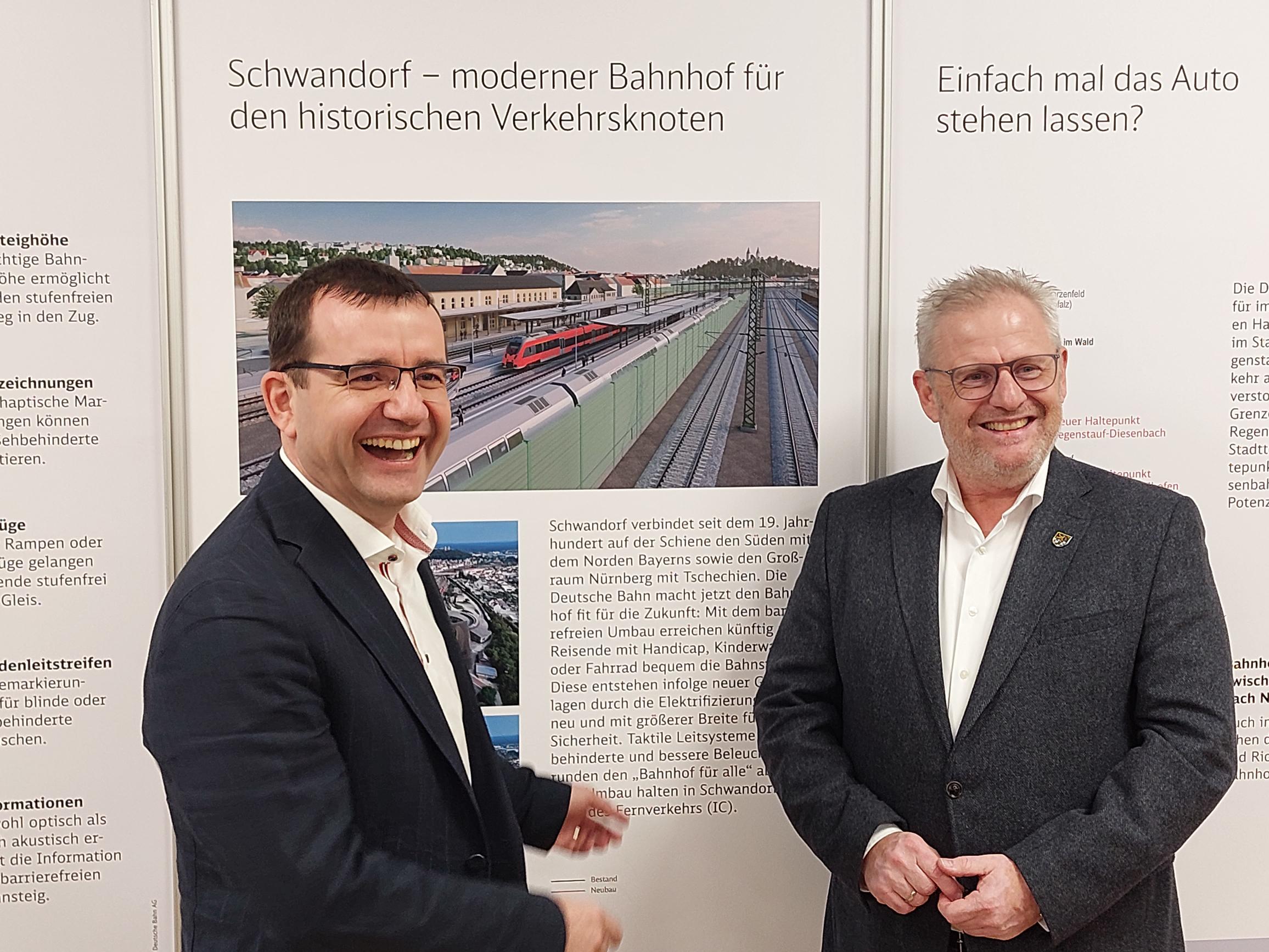 Mit der Elektrifizierung erhält der historische Verkehrsknoten Schwandorf einen modernen Bahnhof. Barrierefrei können Reisende dort nach dem Ausbau auch den Fernverkehr nutzen. Die 110 Besucherinnen und Besucher am Infomarkt in der Oberpfalzhalle tauschten sich mit dem DB-Team zum aktuellen Planungsstand aus. Wir freuen uns auf den nächsten und letzten Infomarkt zum Bahnausbau in der Oberpfalz am 13. März von 15.30 bis 19 Uhr in der Stadthalle Maxhütte-Haidhof.