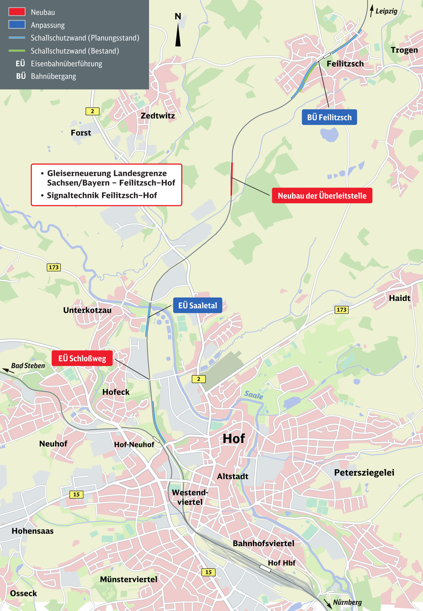 Wesentliche Auswirkung der bestehenden Eisenbahnstrecke auf die Umgebung ist der Verkehrslärm. Um den Lärmschutz zu verbessern plant die DB in diesem Abschnitt weitere Lärmschutzmaßnahmen in Feilitzsch und in Hof. Für die Nachrüstung des Lärmschutzes am Saaleviadukt im Hofer Stadtteil Unterkotzau werden die Brückenkappen verbreitert und Unterschottermatten eingebaut. Insgesamt sind folgende Maßnahmen geplant:
