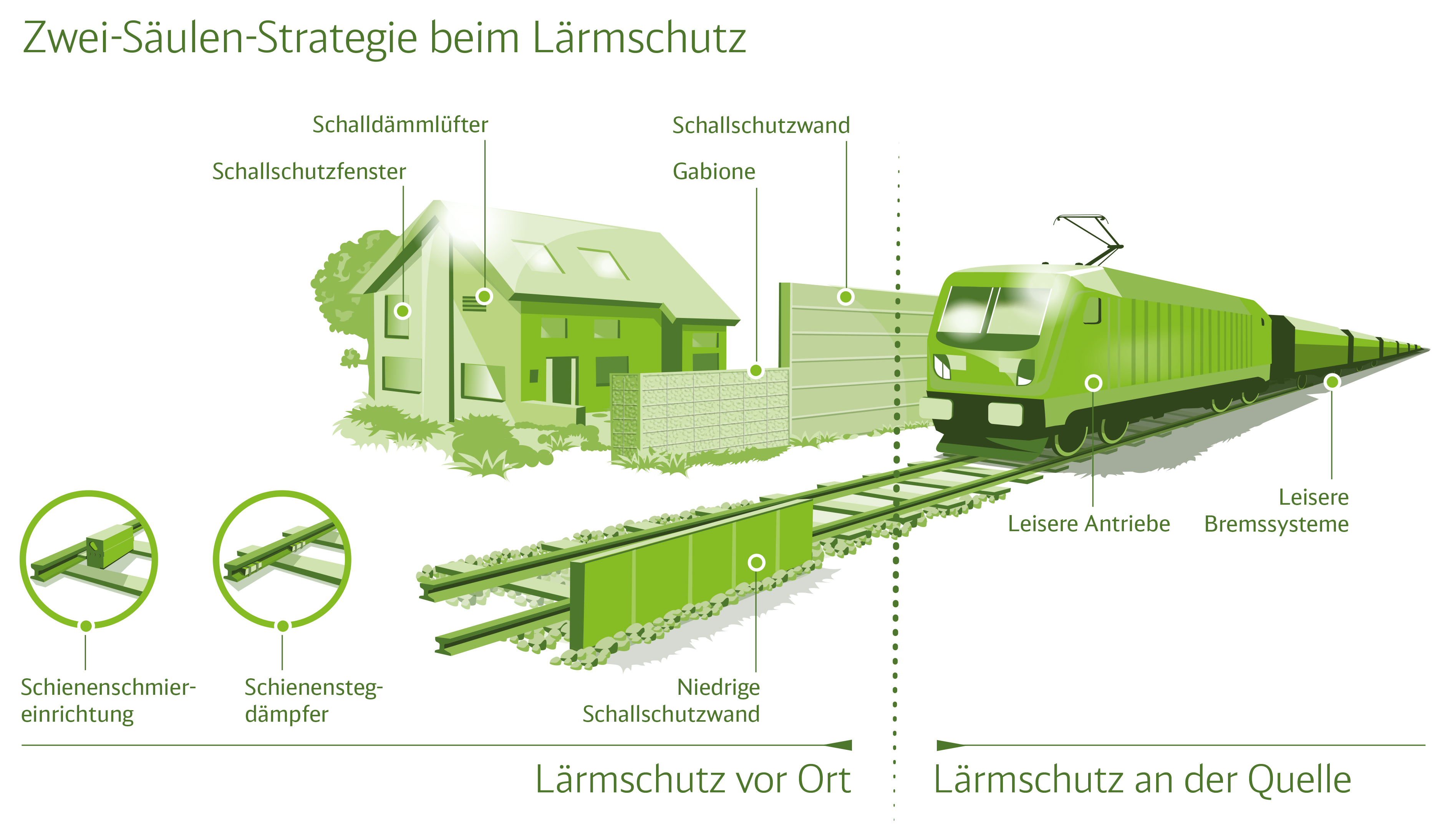 So sorgt die Zwei-Säulen-Strategie für Lärmschutzmaßnahmen insgesamt dafür, den Schienenverkehrslärm zu reduzieren. Lärmschutz ist Umweltschutz.