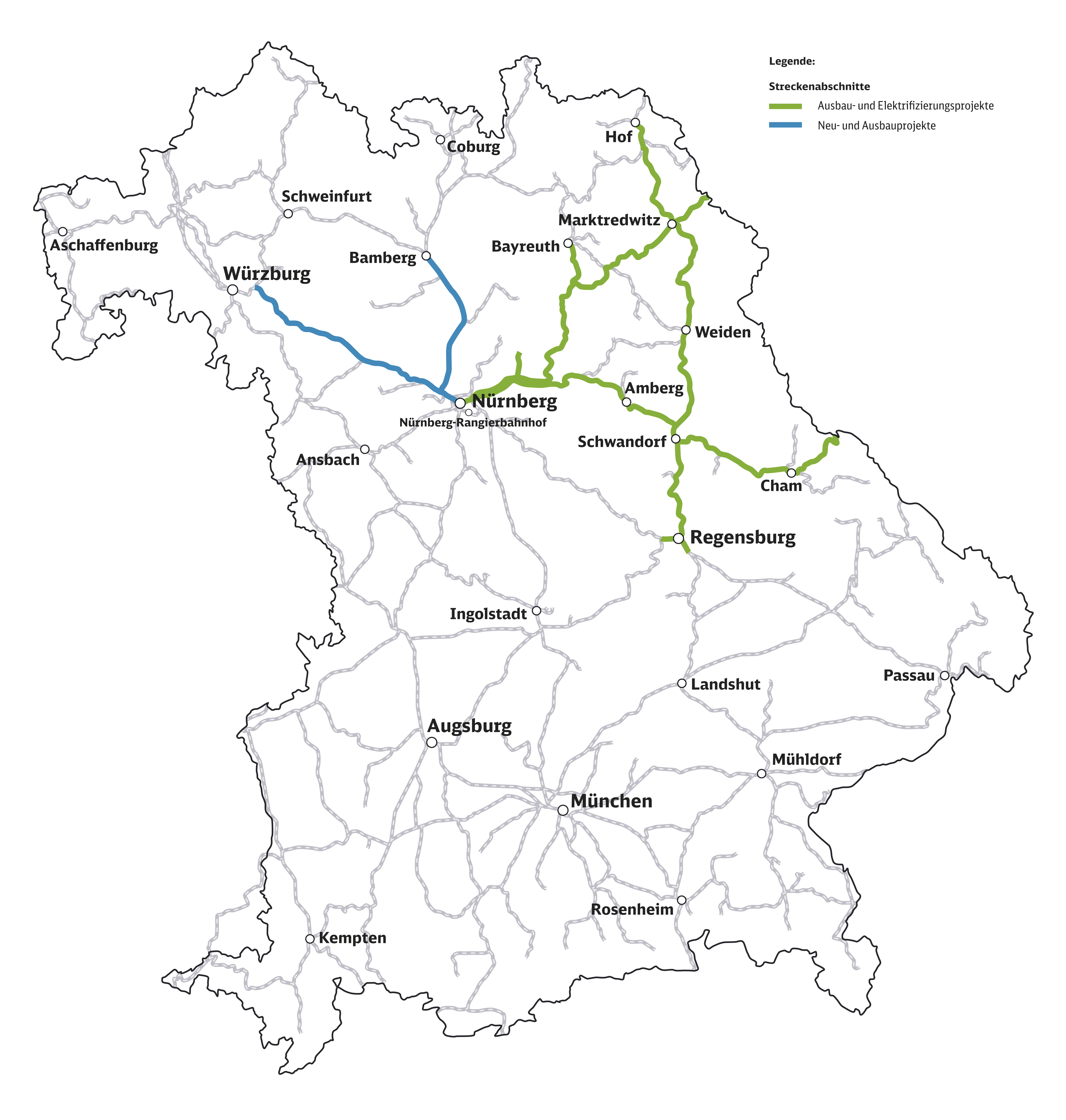 Nicht von ungefähr fuhr hier zwischen Nürnberg und Fürth 1835 die erste deutsche Eisenbahn. Auch heute verbinden die nordbayerischen Bahnstrecken den Mittelmeerraum mit Skandinavien und Frankreich mit Osteuropa. Klar ist auch: Das Schienennetz muss infolge der jahrzehntelangen Zonenrandlage während der Teilung des Kontinents verbessert werden. Elektrifizierung, Modernisierung und der Ausbau von Bahnhöfen bergen viel Potenzial, um die Region wirtschaftlich weiter zu stärken und mehr Zuverlässigkeit für Reisende schaffen.