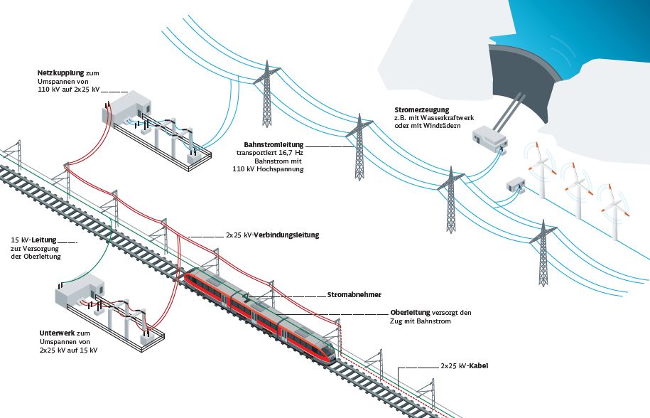 Auf Deutschlands Bahnstrecken fahren seit über 100 Jahren elektrische Züge. Allerdings kann für den elektrischen Zugbetrieb nicht einfach Strom aus der Steckdose verwendet werden. Denn damals wie heute benötigen die Züge eine Frequenz von 16,7 Hertz, während das öffentliche Stromnetz mit 50 Hertz betrieben wird. Für einen zuverlässigen Bahnbetrieb ist eine ausfallsichere und leistungsfähige Versorgung mit Strom erforderlich. Dazu gehört die Erzeugung des Bahnstroms, der Transport zu den einzelnen Bahnstrecken und die Einspeisung in die Oberleitung. Eine Besonderheit im Bahnbetrieb ist die Rückspeisung der Bremsenergie ins Bahnstromnetz.